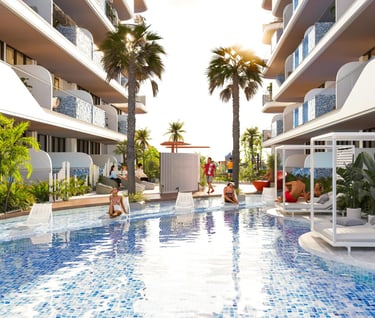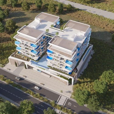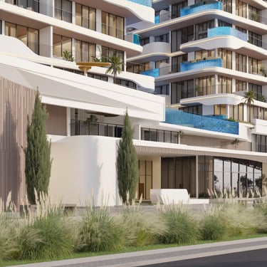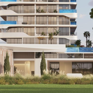 A lo largo de la orilla, las líneas elegantes y el diseño sofisticado armoniza con la bellza natural que lo rodea. Las amplias ventanas reflejan el cielo azul claro y el mar resplandeciente de fondo, creando una mezcla unificada entre las estructura y su impresionante entorno. Desde los balcones elegantes hasta los acabados impecables, cada detalle refleja una artesanía y lujo incomparables.