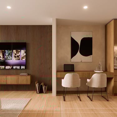 Estas unidades, completamente amuebladas y decoradas, presentan un diseño de concepto abierto que integra de manera fluida las áreas de sala, comedor y una cocina totalmente equipada, ideal para un estilo de vida moderno.